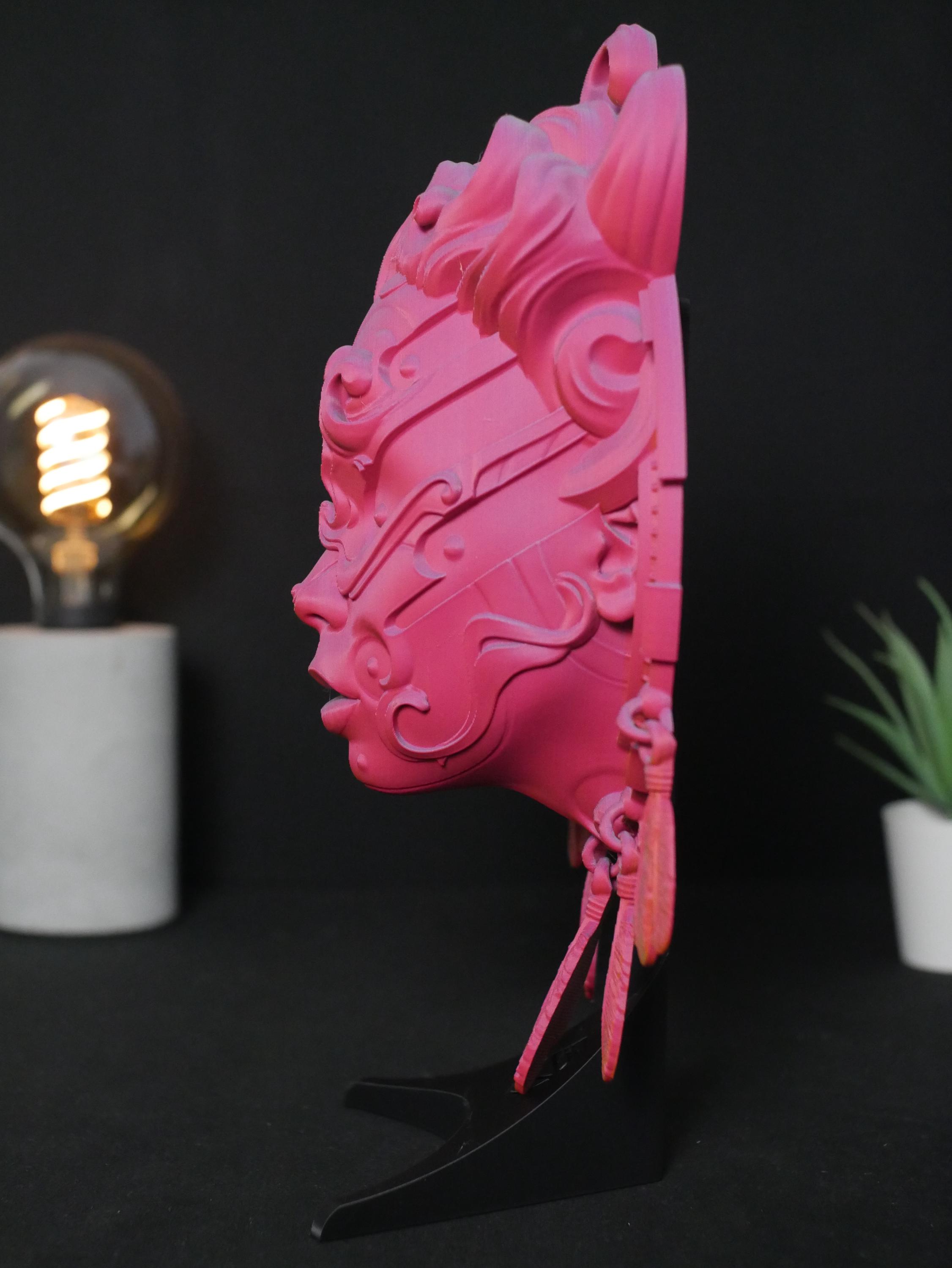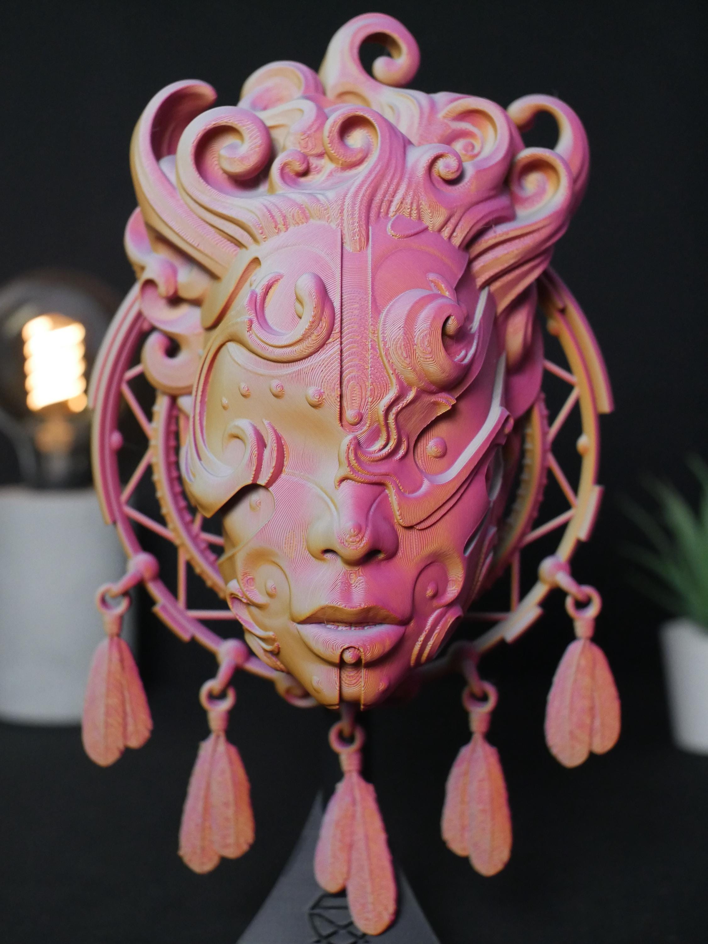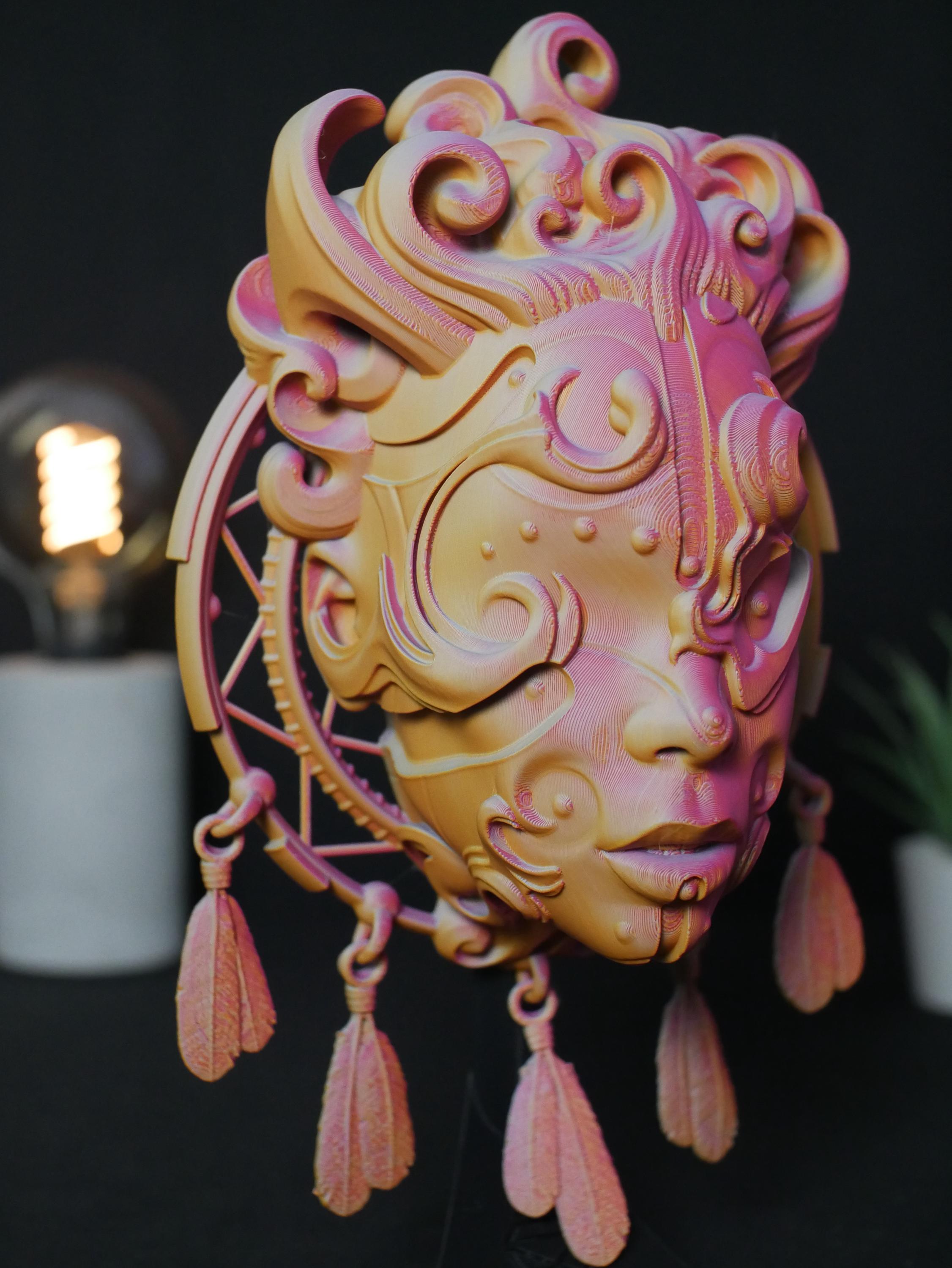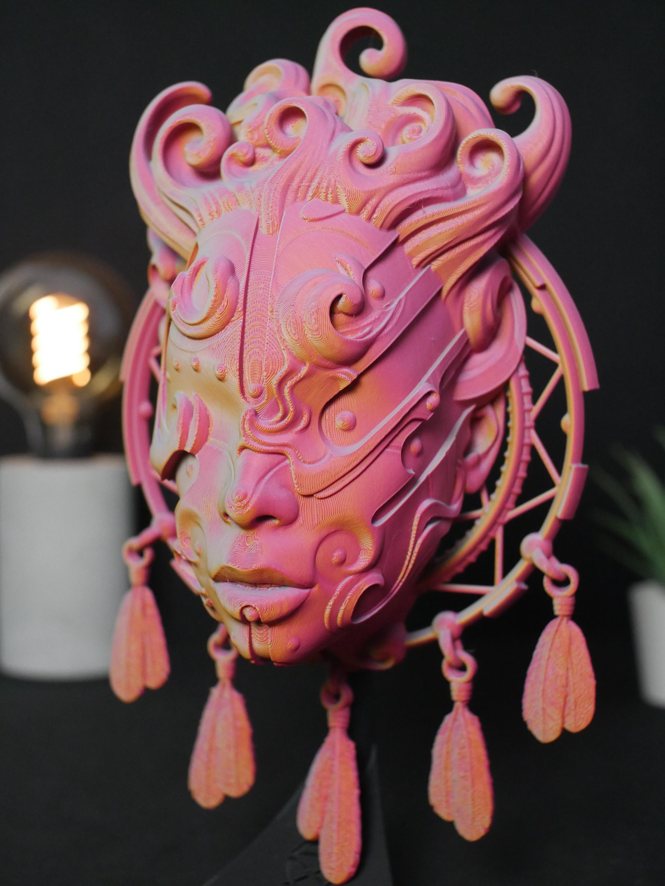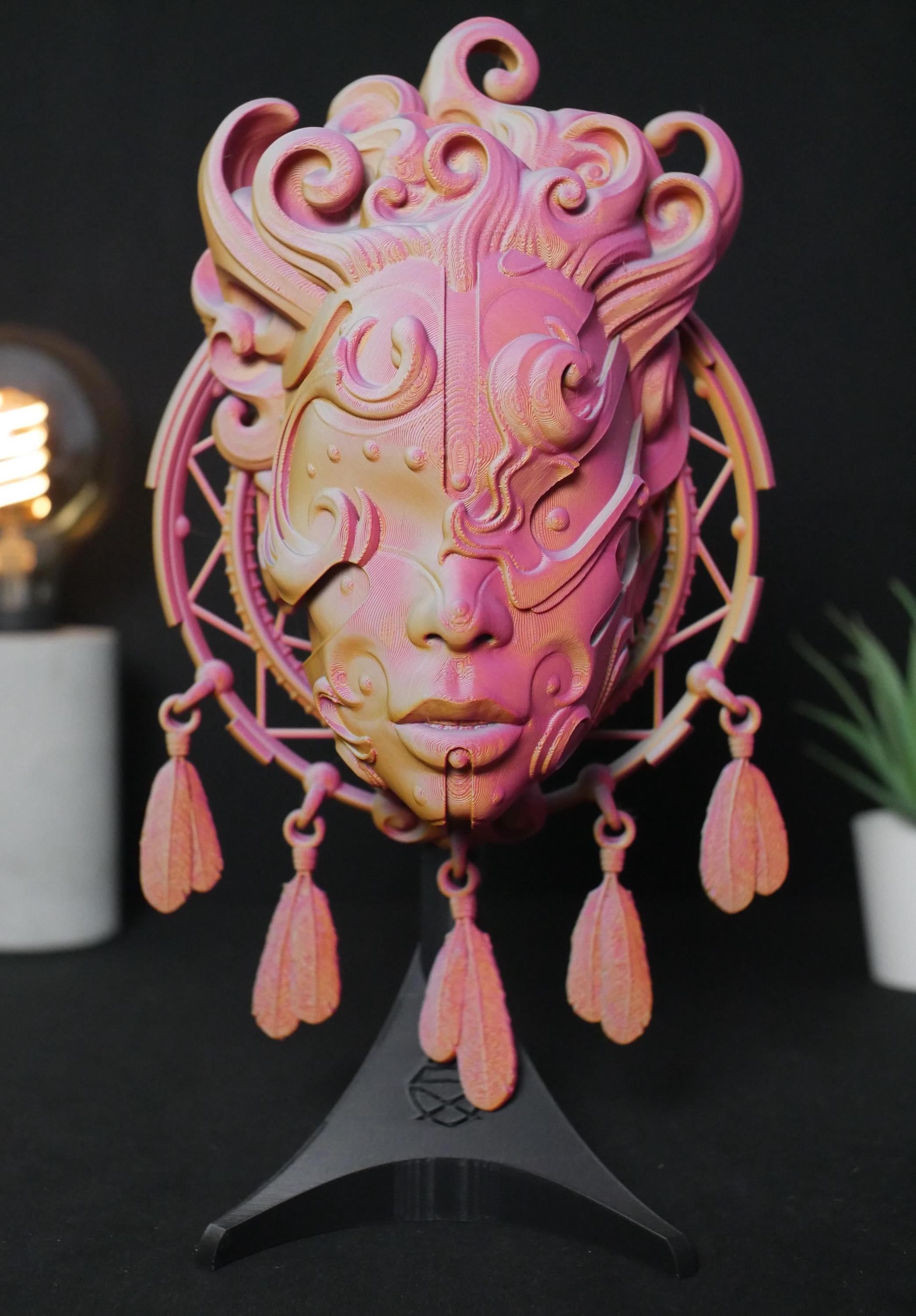Summon a unique and enchanting atmosphere into your home with this intricately detailed 3D printed sculpture. Designed for the modern bohemian, the spiritual seeker, and the lover of fantasy art, this piece acts as a guardian of your space, blending the protective essence of a dreamcatcher with the tranquil visage of a celestial goddess.