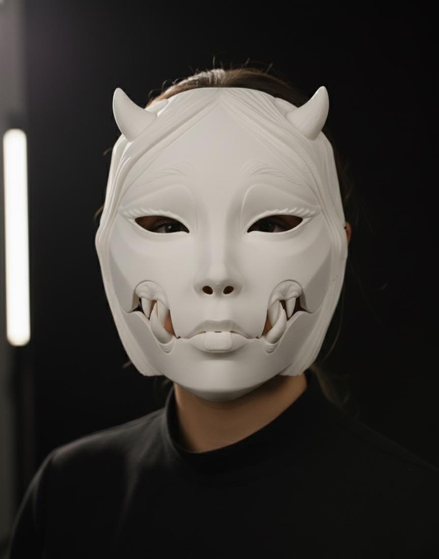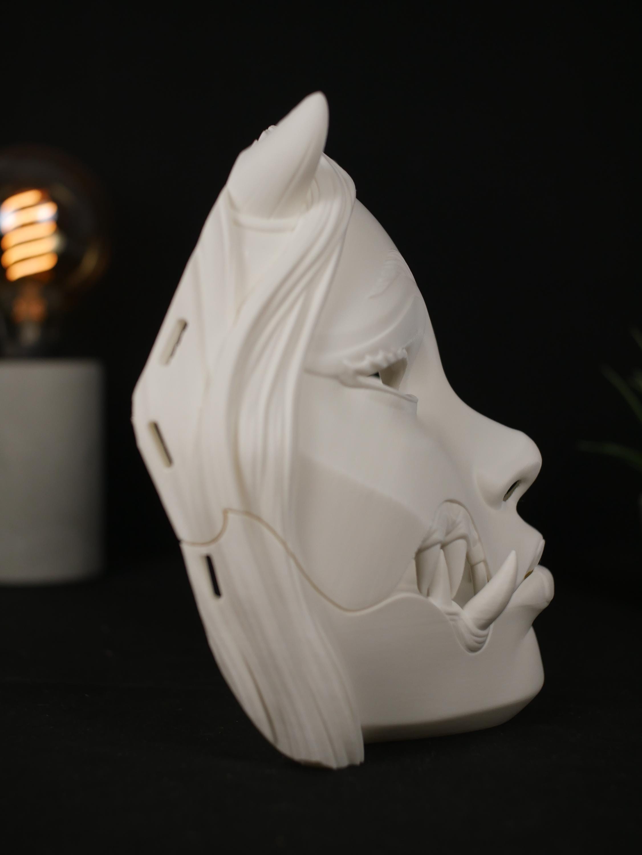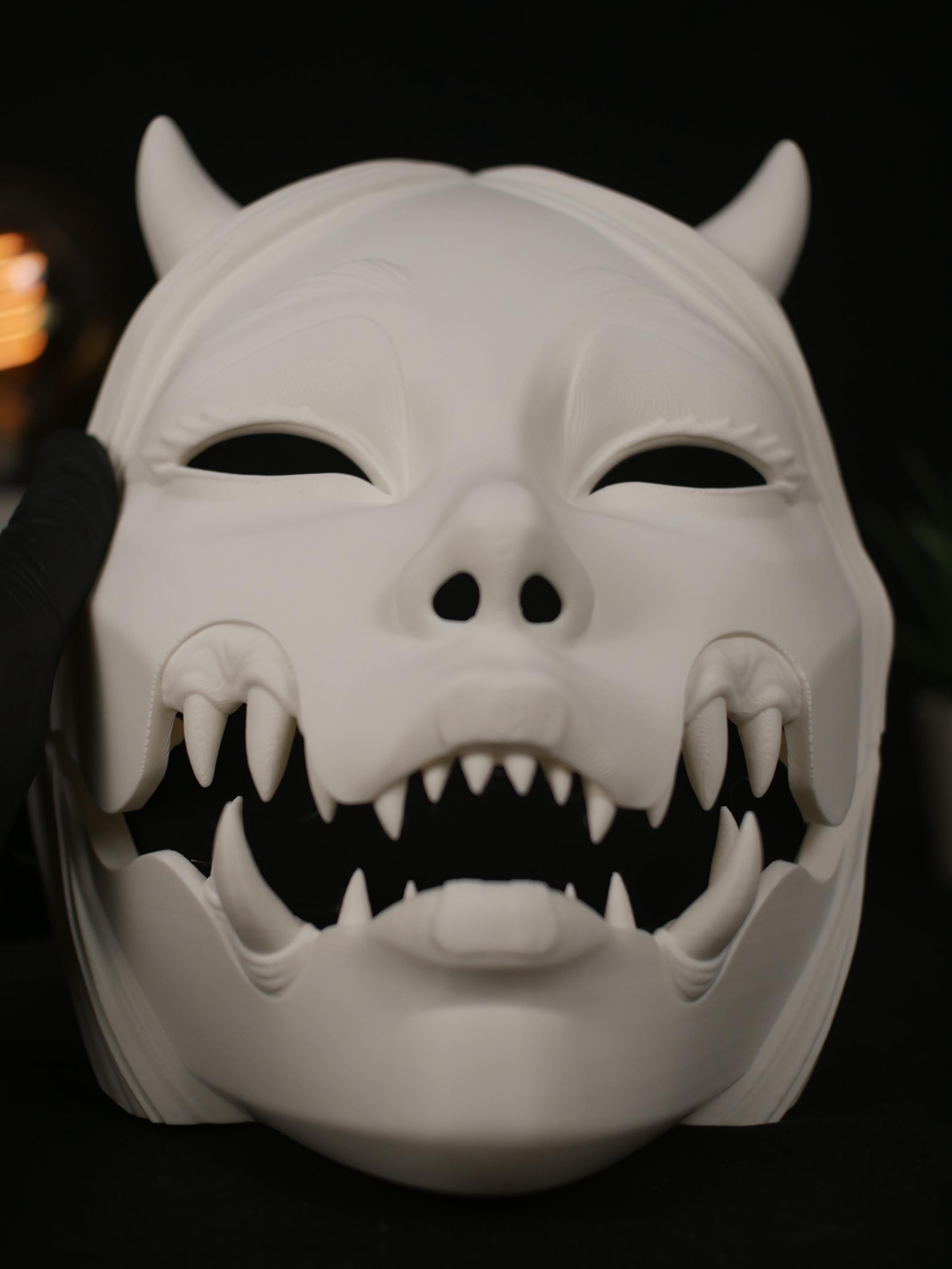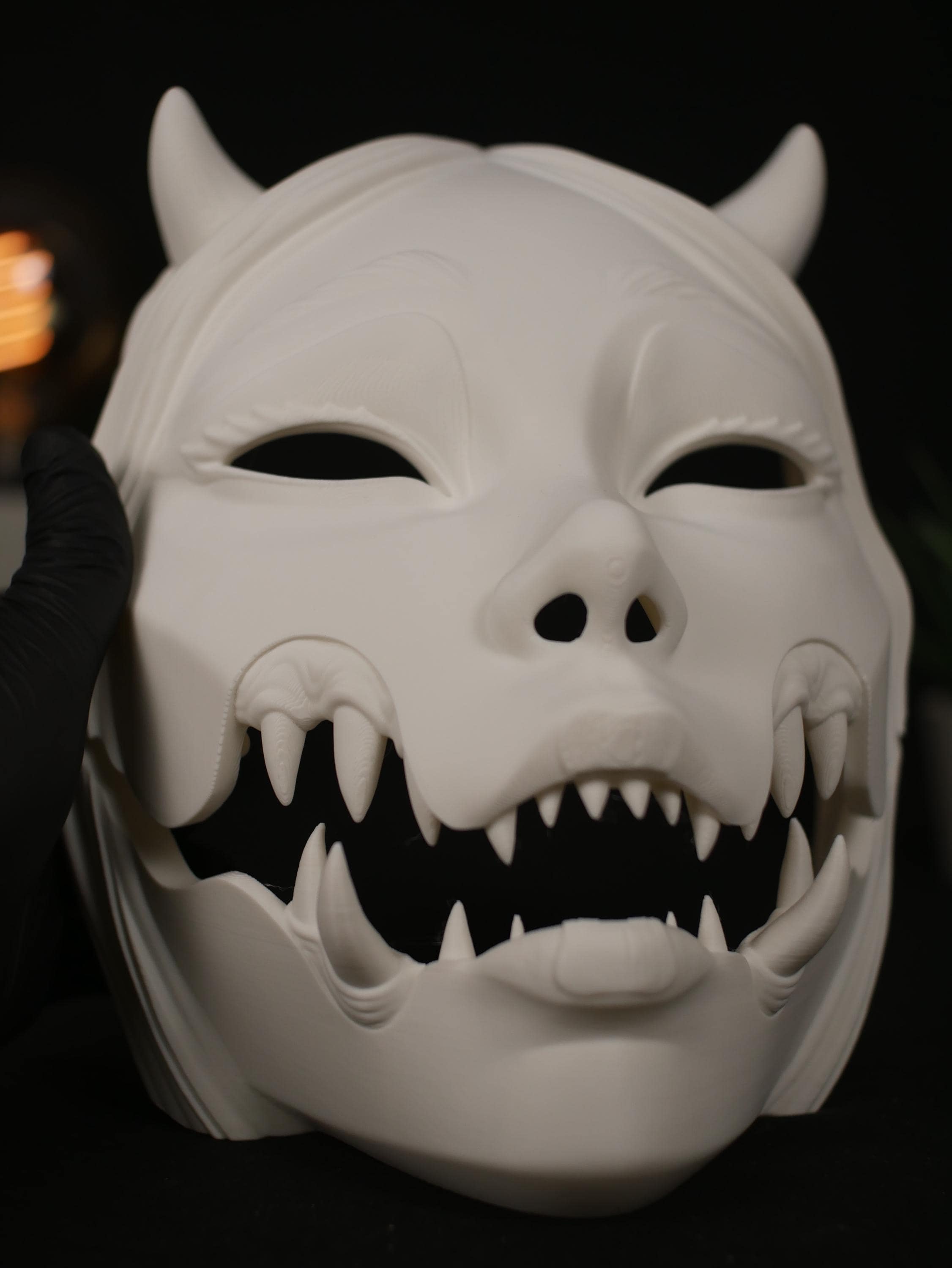Bring the chilling legend of the Kuchisake-onna (Slit-Mouthed Woman) to life with this incredibly detailed and fully articulated mask! Designed with a terrifying fusion of traditional Oni demon horns and the iconic, gaping maw of the urban legend, this mask features a moving jaw that responds to your own movements, making it the ultimate centerpiece for your next cosplay, Halloween costume, or horror collection.