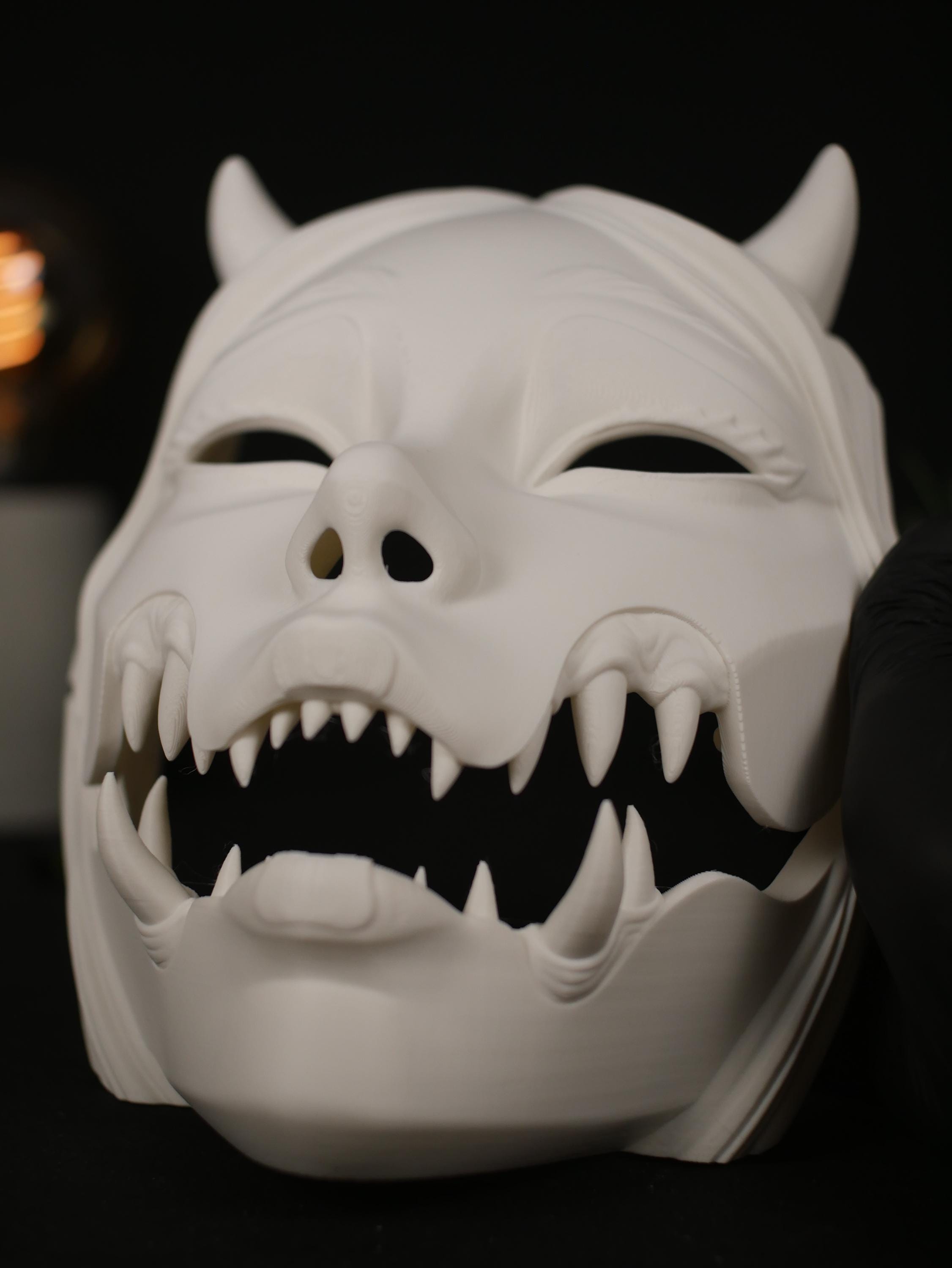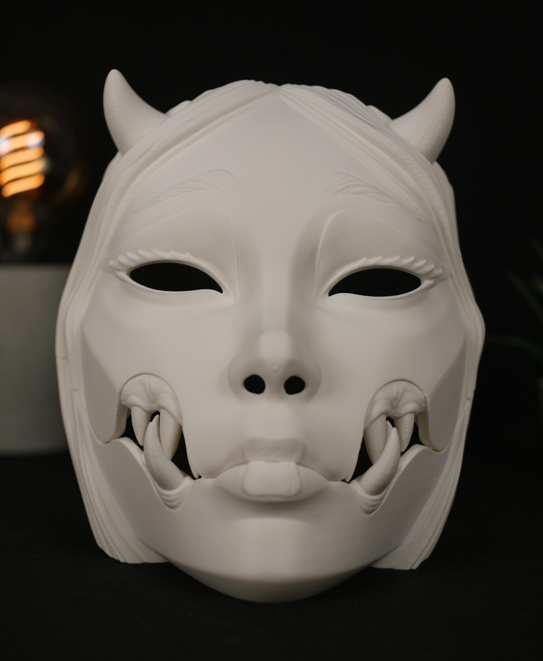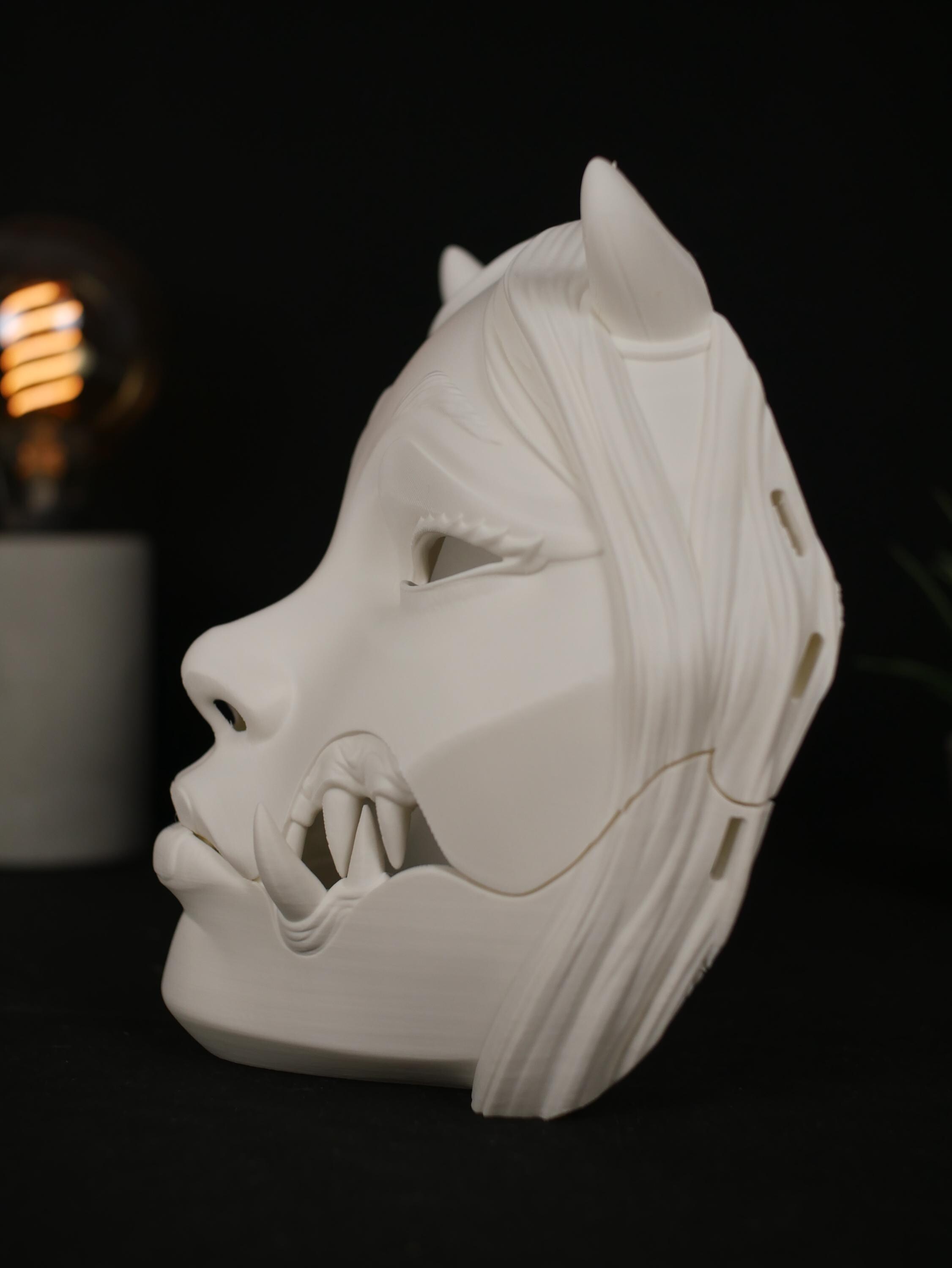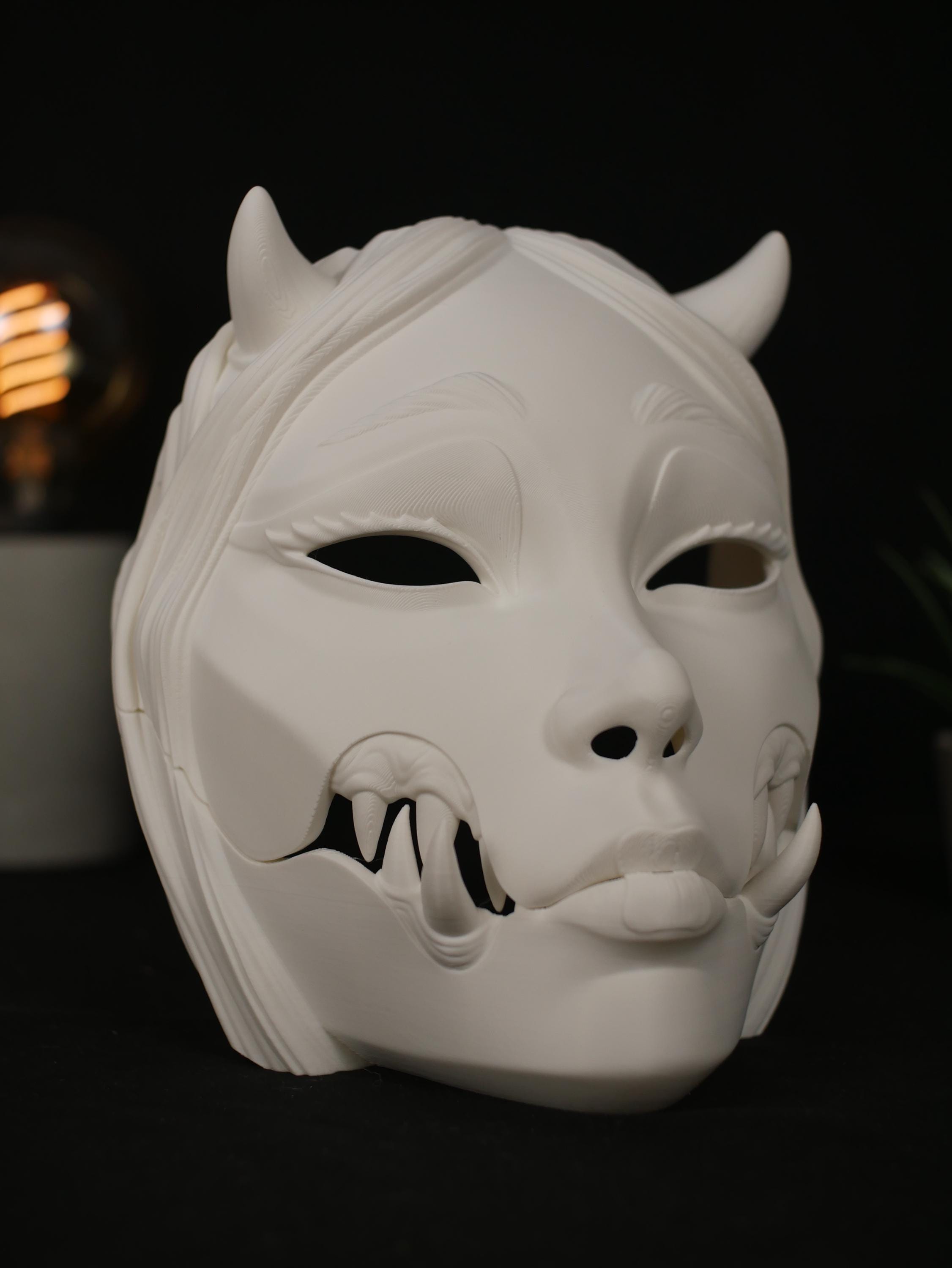 Bring the chilling legend of the Kuchisake-onna (Slit-Mouthed Woman) to life with this incredibly detailed and fully articulated mask! Designed with a terrifying fusion of traditional Oni demon horns and the iconic, gaping maw of the urban legend, this mask features a moving jaw that responds to your own movements, making it the ultimate centerpiece for your next cosplay, Halloween costume, or horror collection.