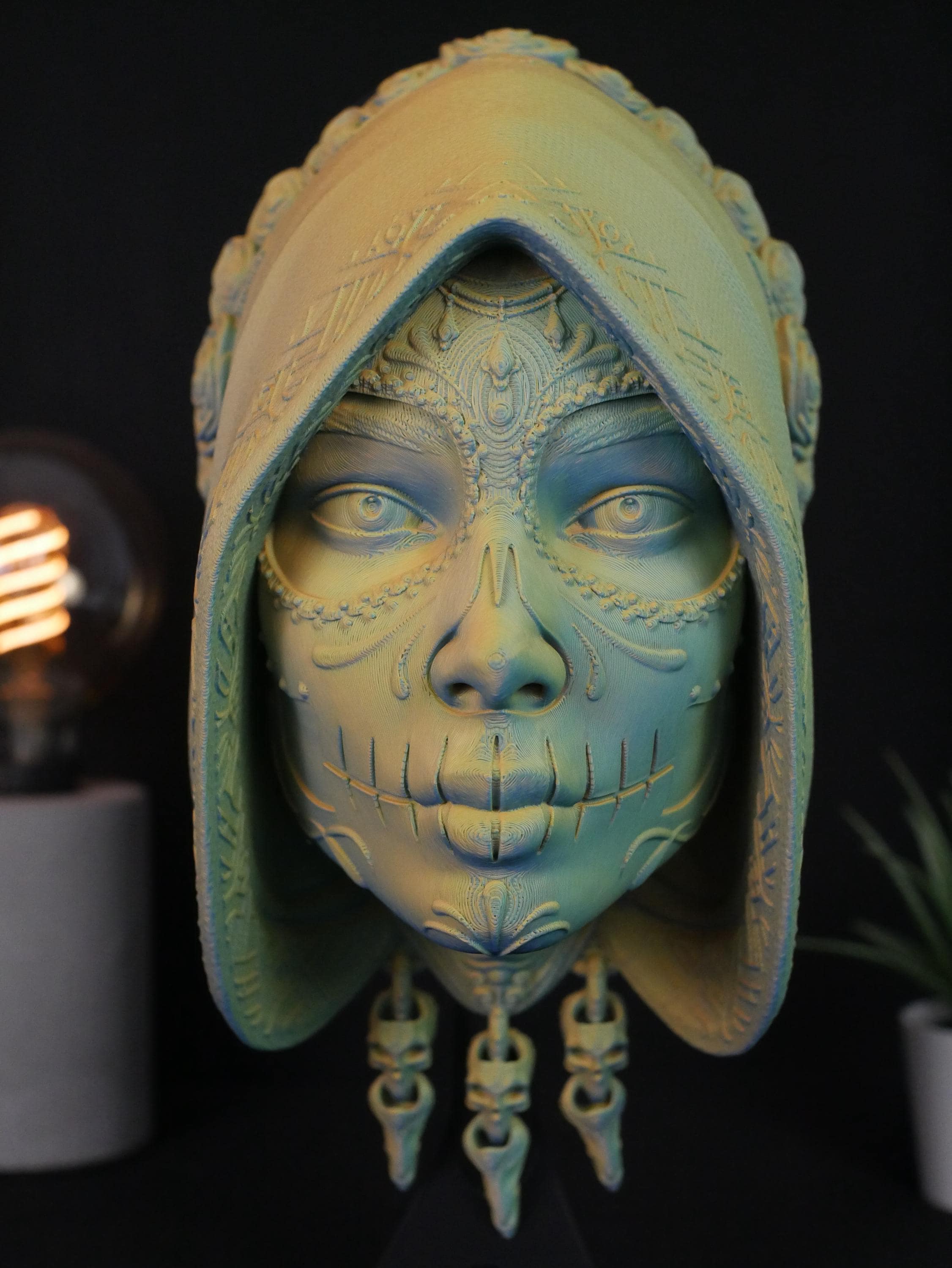 Incredible Detail: From the "Day of the Dead" facial markings to the texture of the hood, every layer is 3D printed with precision.