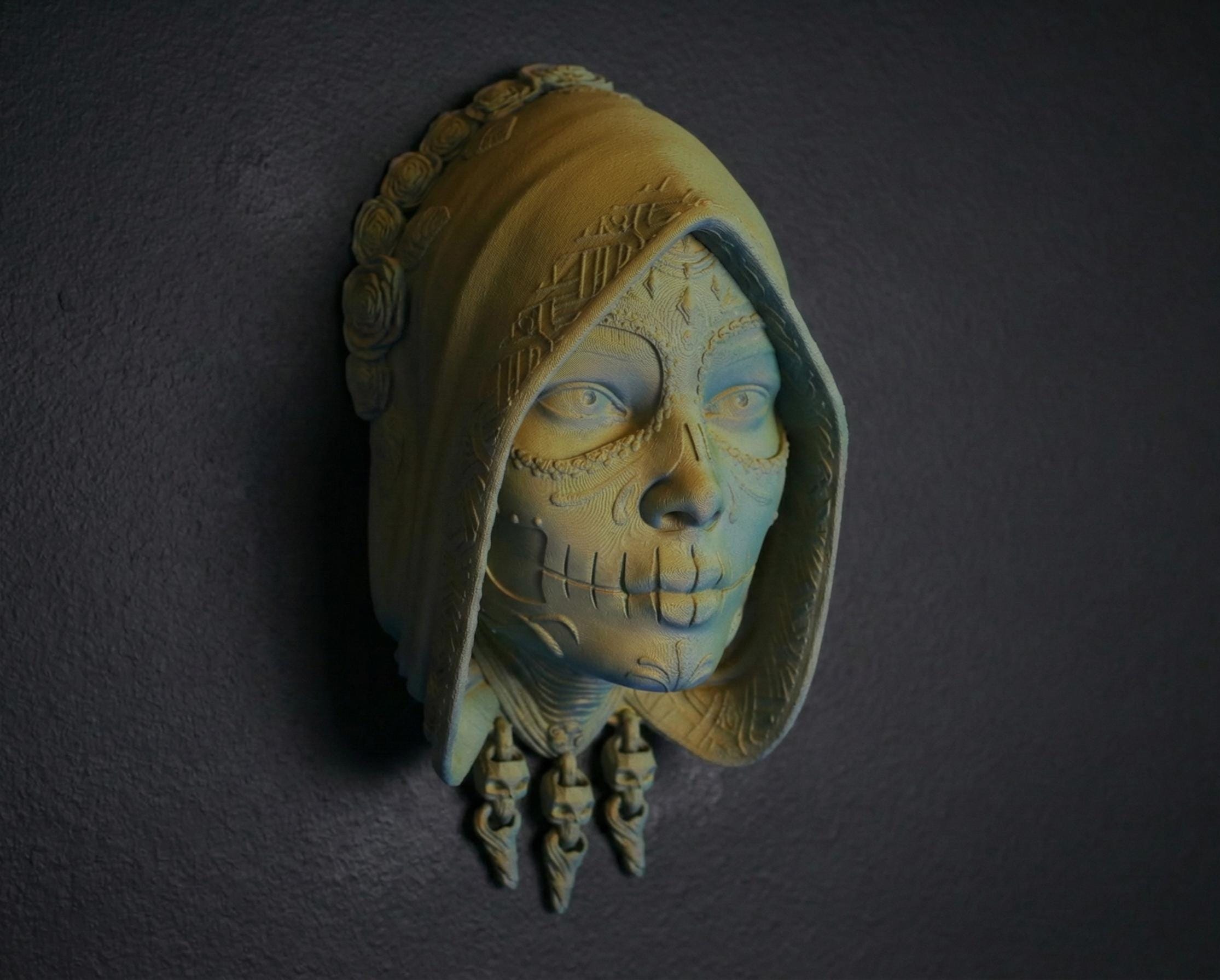 Bring a touch of the mystical into your home with this intricately detailed bust. merging the beauty of La Catrina with dark Gothic aesthetics. Designed as a captivating Wall Art piece, this sculpture features exquisite relief patterns, floral rose accents on the hood, and hanging skull charms that add movement and depth to the design.