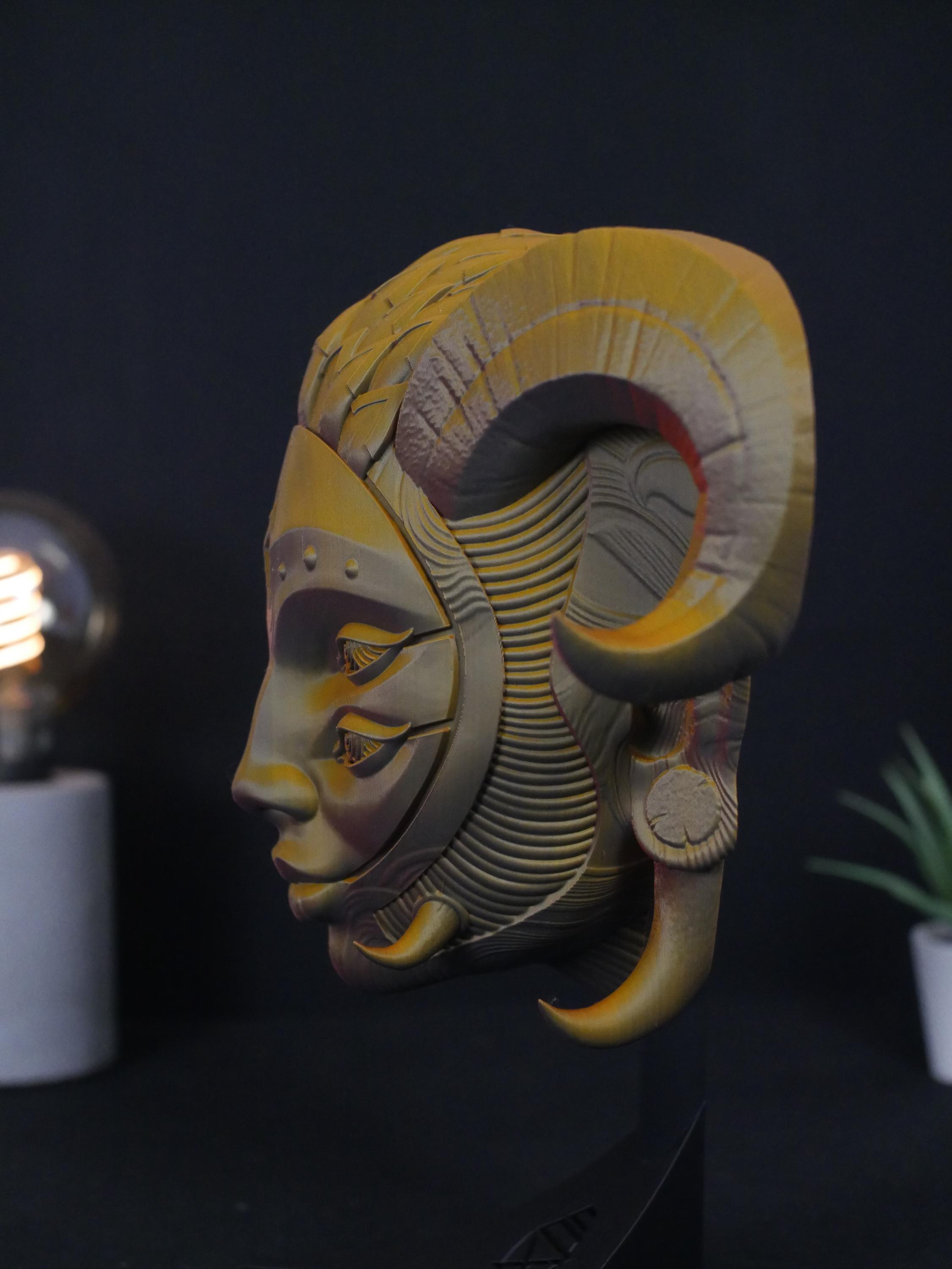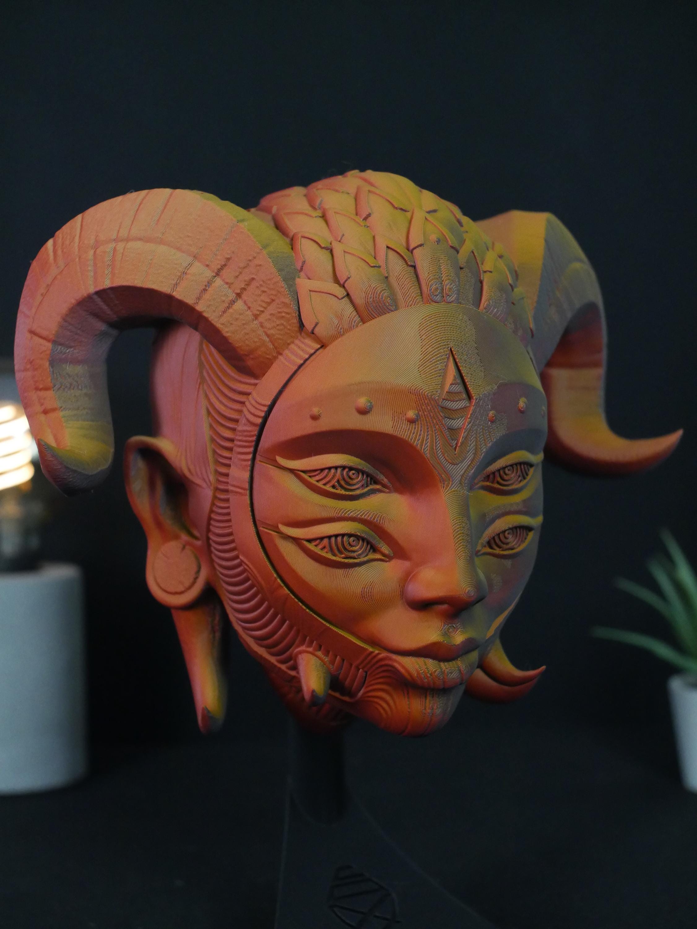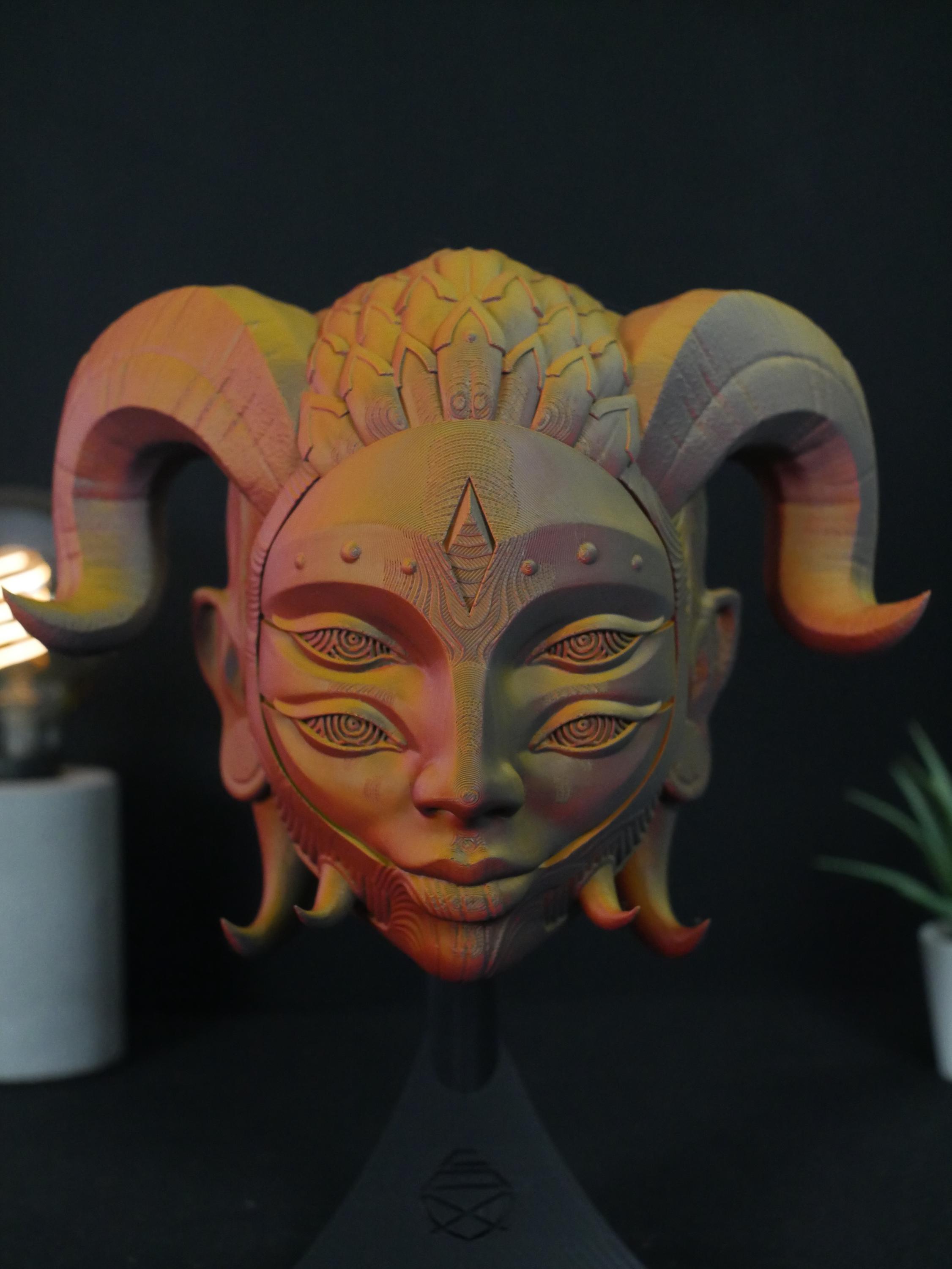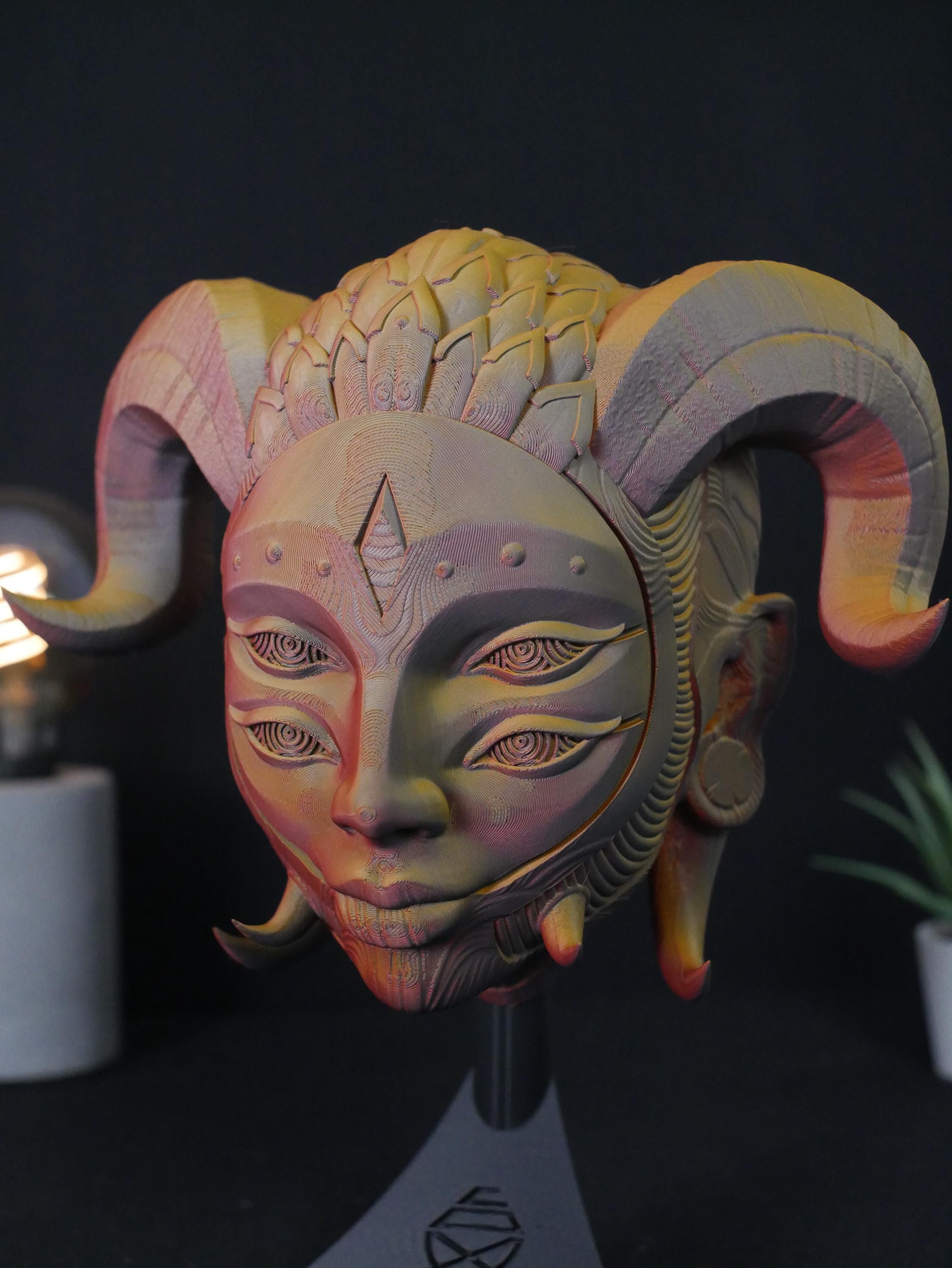 Transform your space with a touch of the surreal. This mesmerizing Harlequin sculpture is not just a decoration; it is a portal to a world of fantasy and mystery. With its multi-eyed gaze and intricate horned design, it captures the essence of a mystical jester watching over your sanctuary.