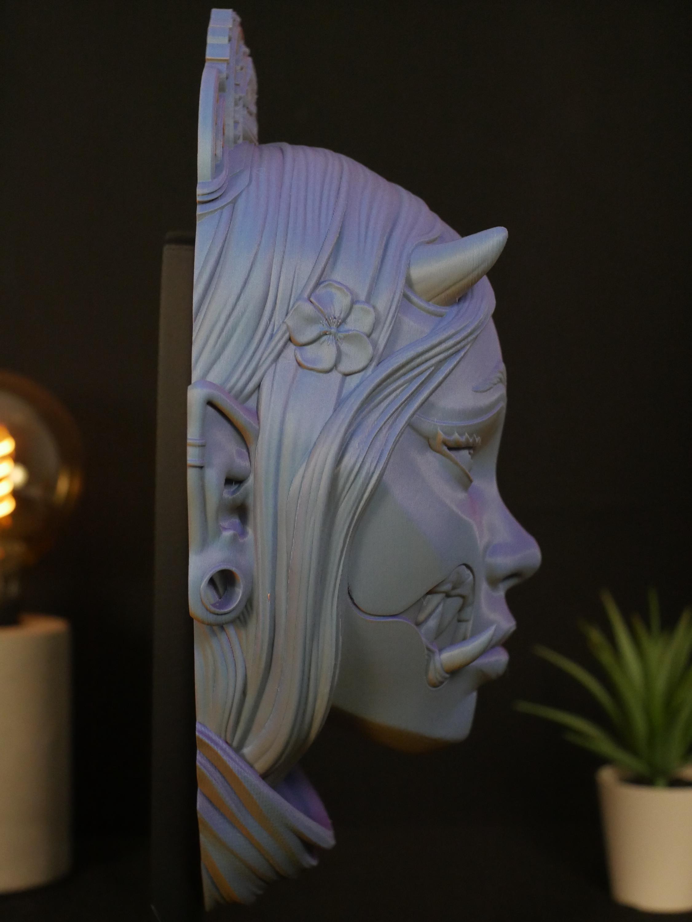 The sculpture blends eerie elegance with terrifying detail, from the delicate flowers in her hair and traditional horns (Oni) to the hauntingly revealed jaw that gives her the Kuchisake name. It's a perfect blend of macabre beauty and traditional Japanese yokai legend.