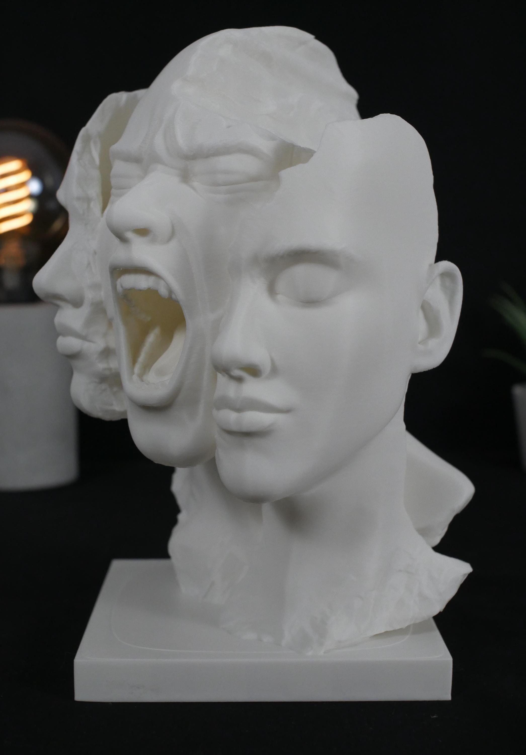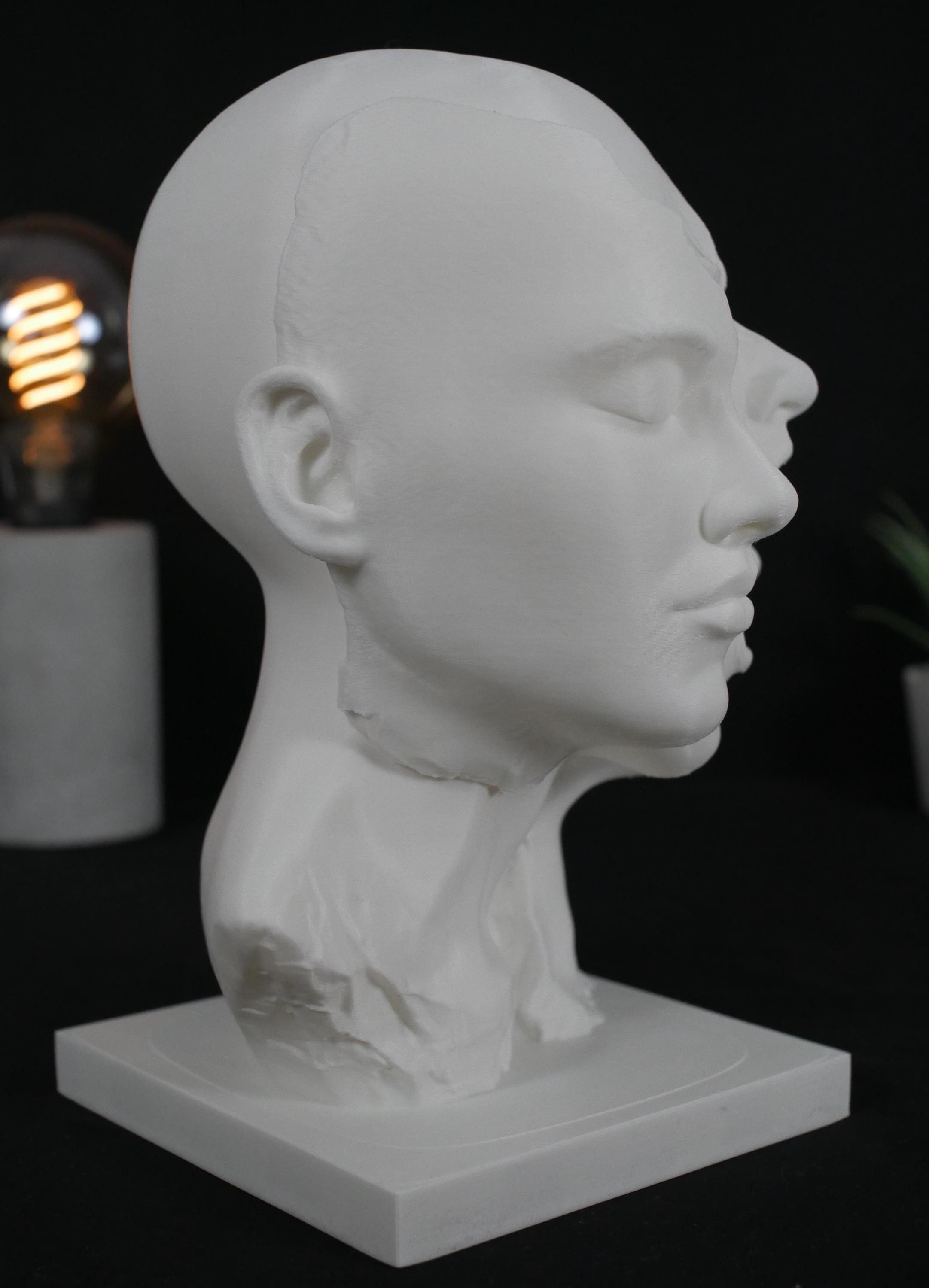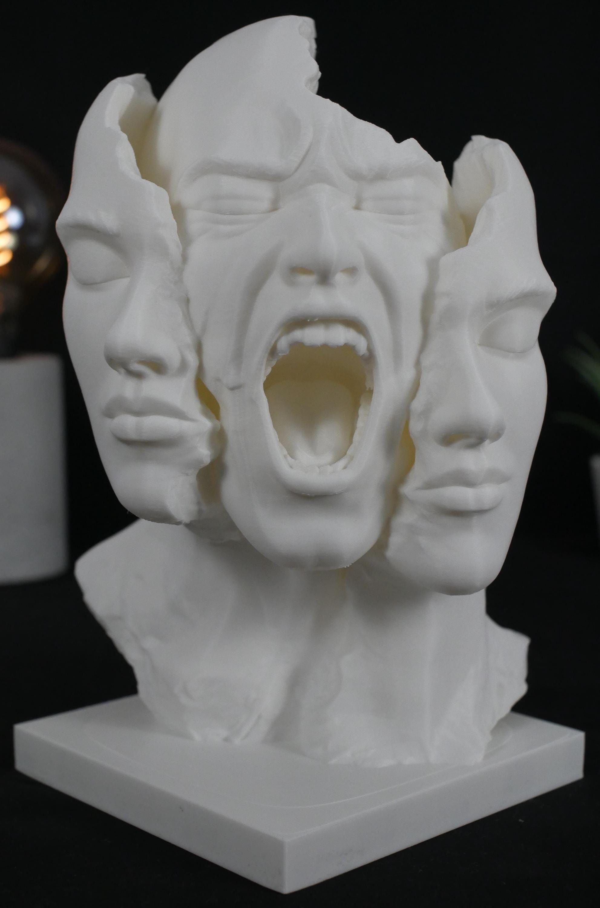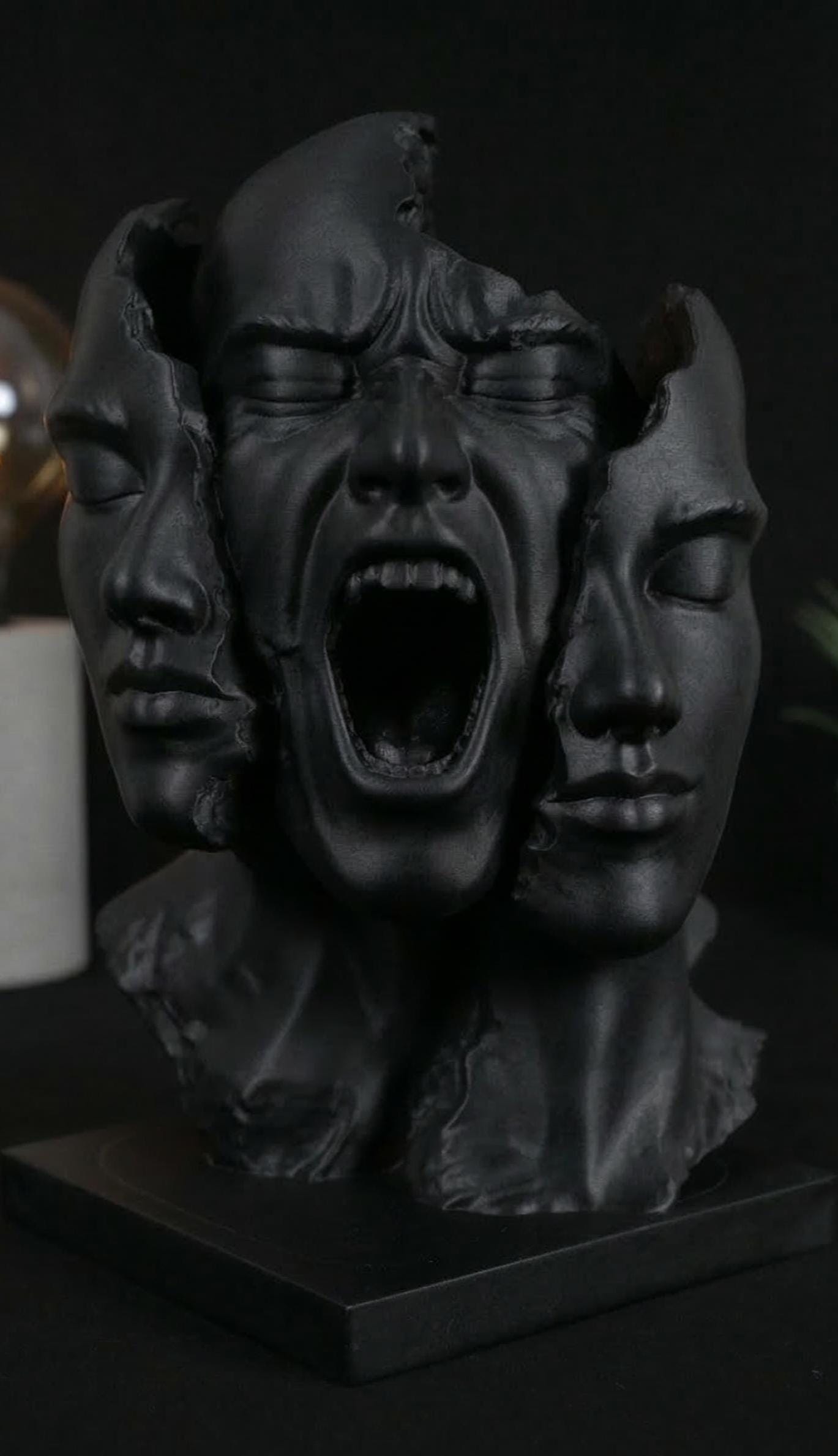 Add a striking centerpiece to your space with this surreal "Split Face" sculpture. Capturing raw emotion and abstract beauty, this piece is perfect for lovers of dark academia, psychological art, and modern eclectic decor. Whether displayed on a bookshelf, desk, or mantle, it is guaranteed to be an unforgettable conversation starter.