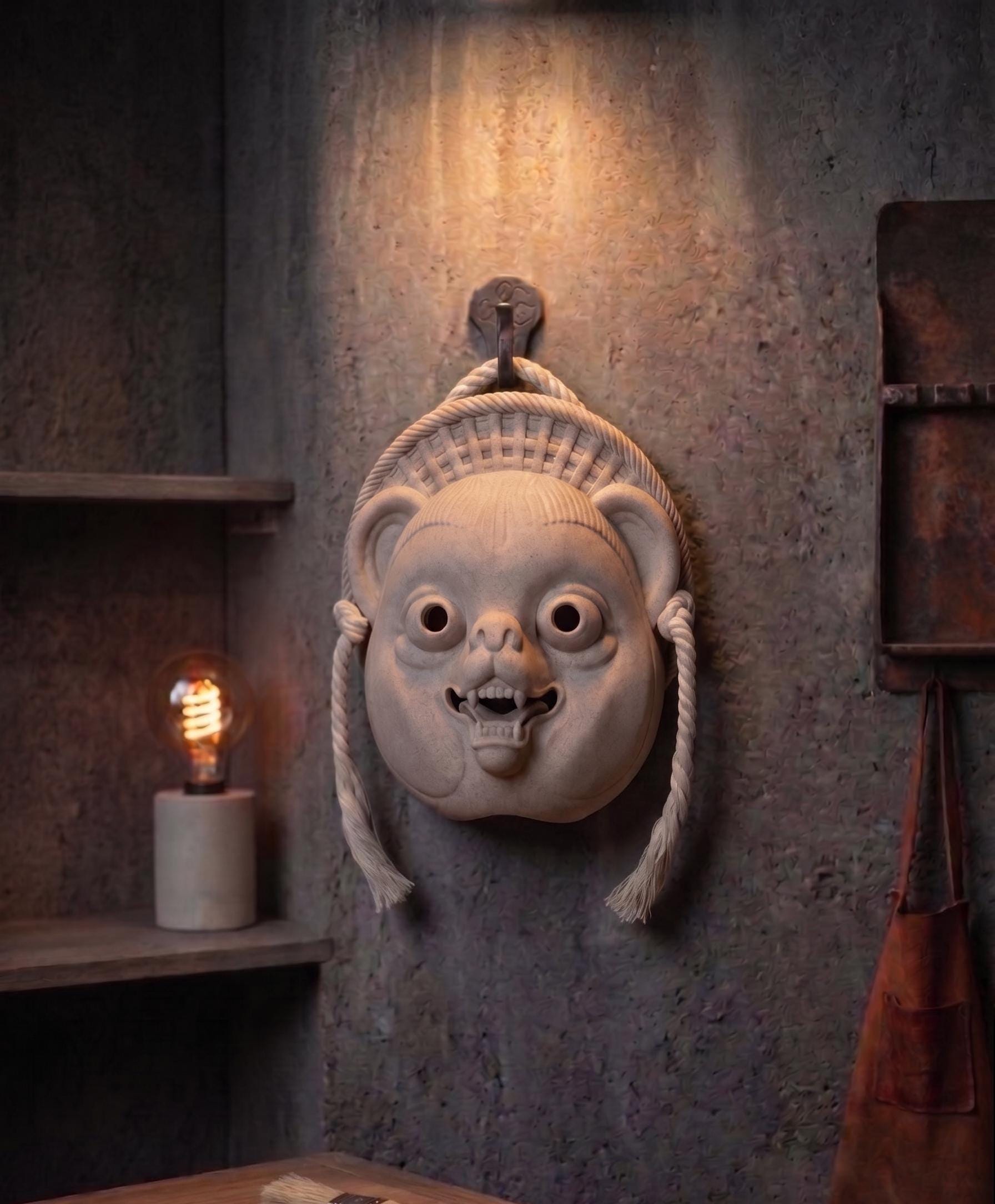 Our Tanuki mask captures the essence of the "Japanese Raccoon Dog" with its iconic straw hat texture and jovial expression. Each piece comes complete with a traditional decorative rope, making it ready to hang and instantly elevating your gallery wall, office, or living space.
