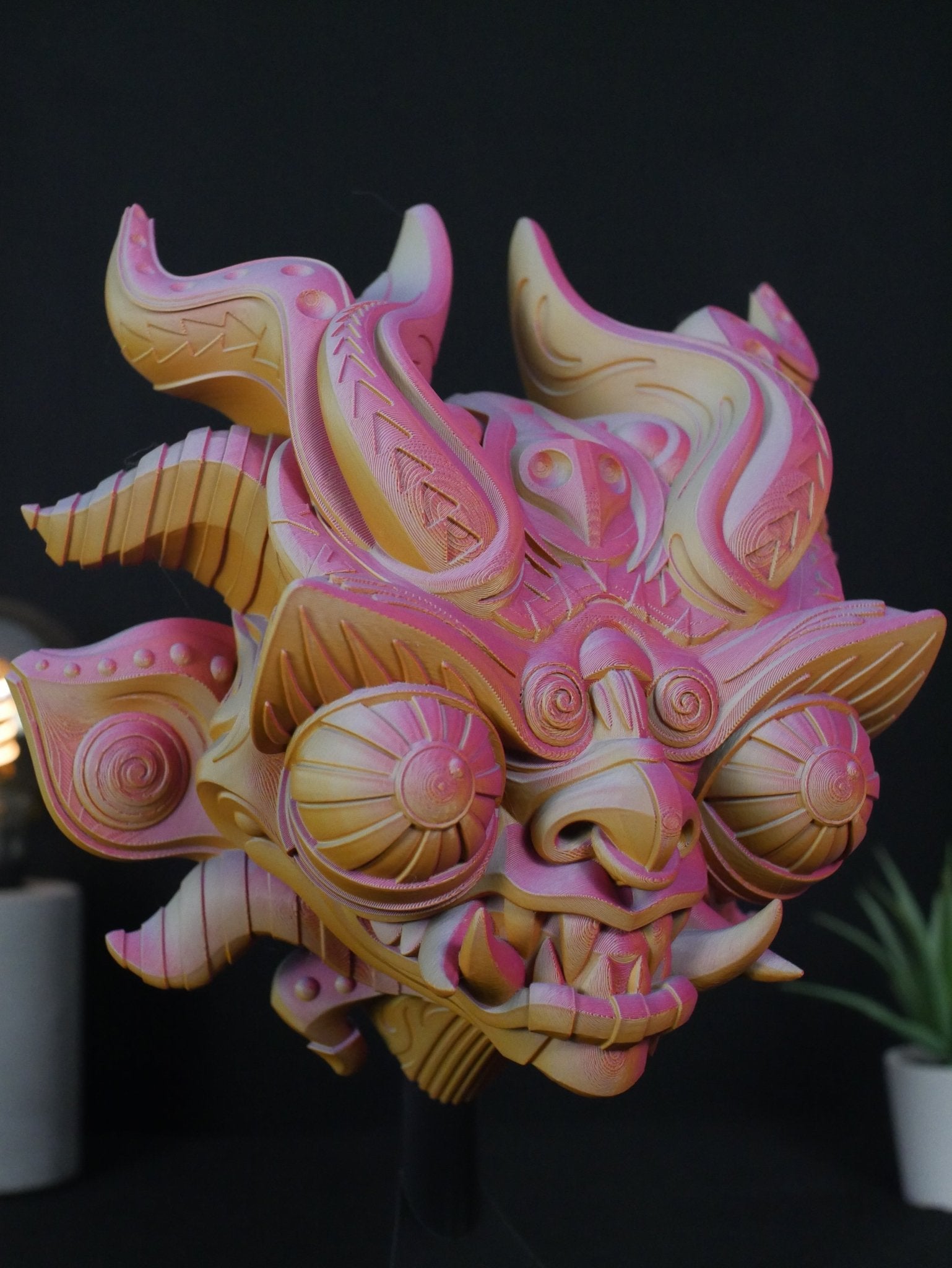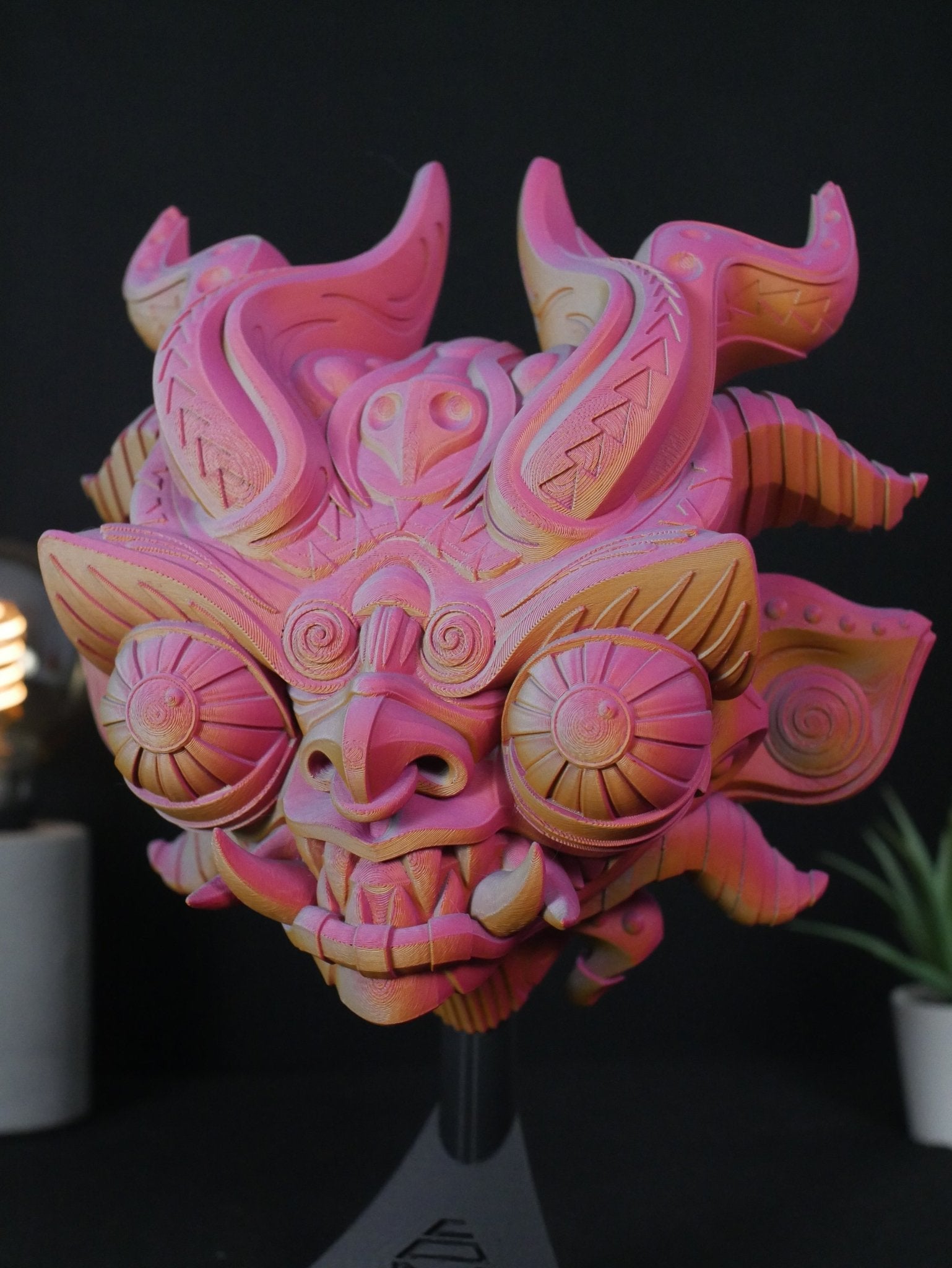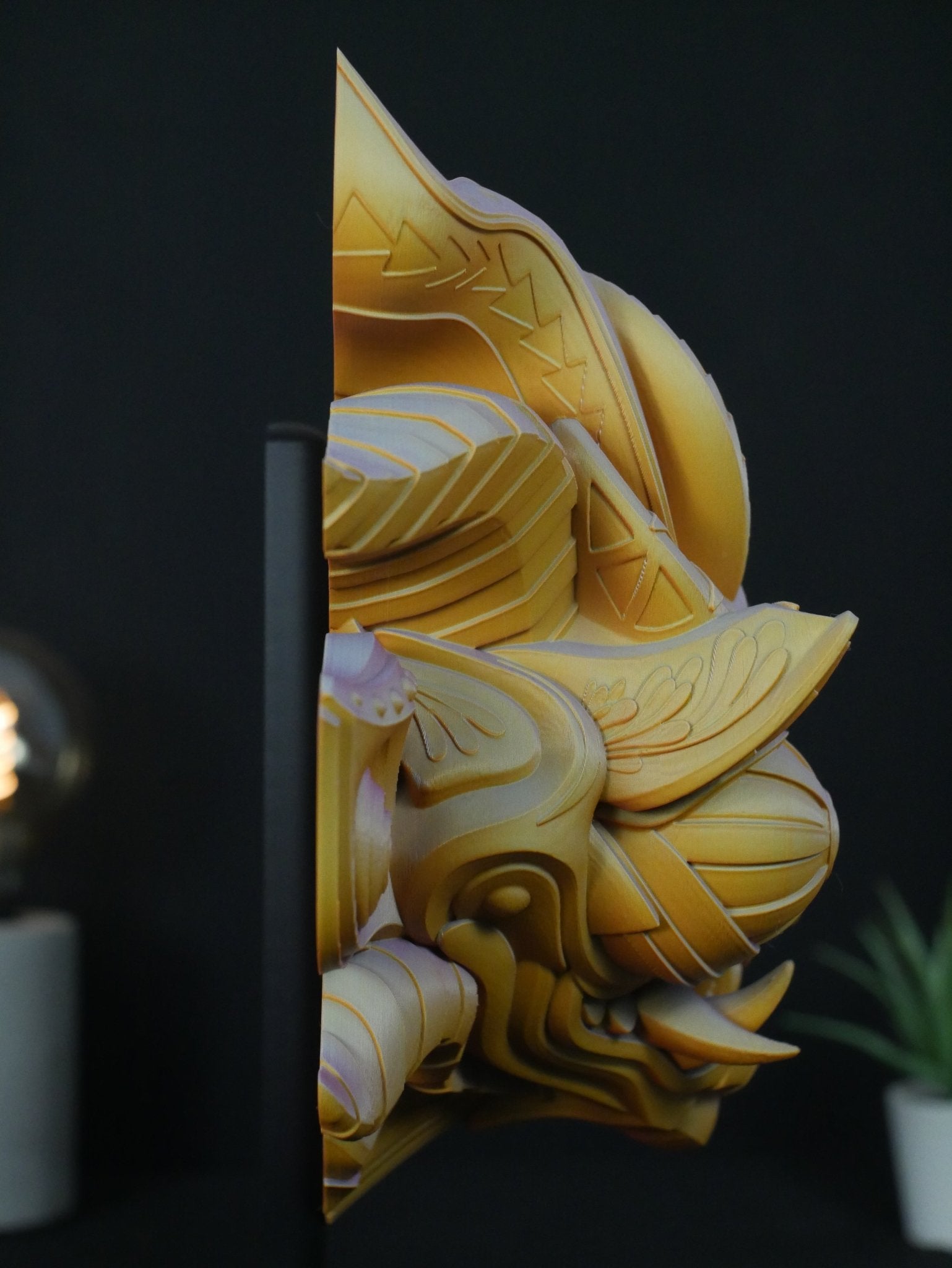 - Decoración de Estantería: Cada pedido incluye un soporte de exhibición a medida. Simplemente coloca la máscara sobre el soporte para lucirla en tu escritorio, biblioteca, recibidor o mesa auxiliar.