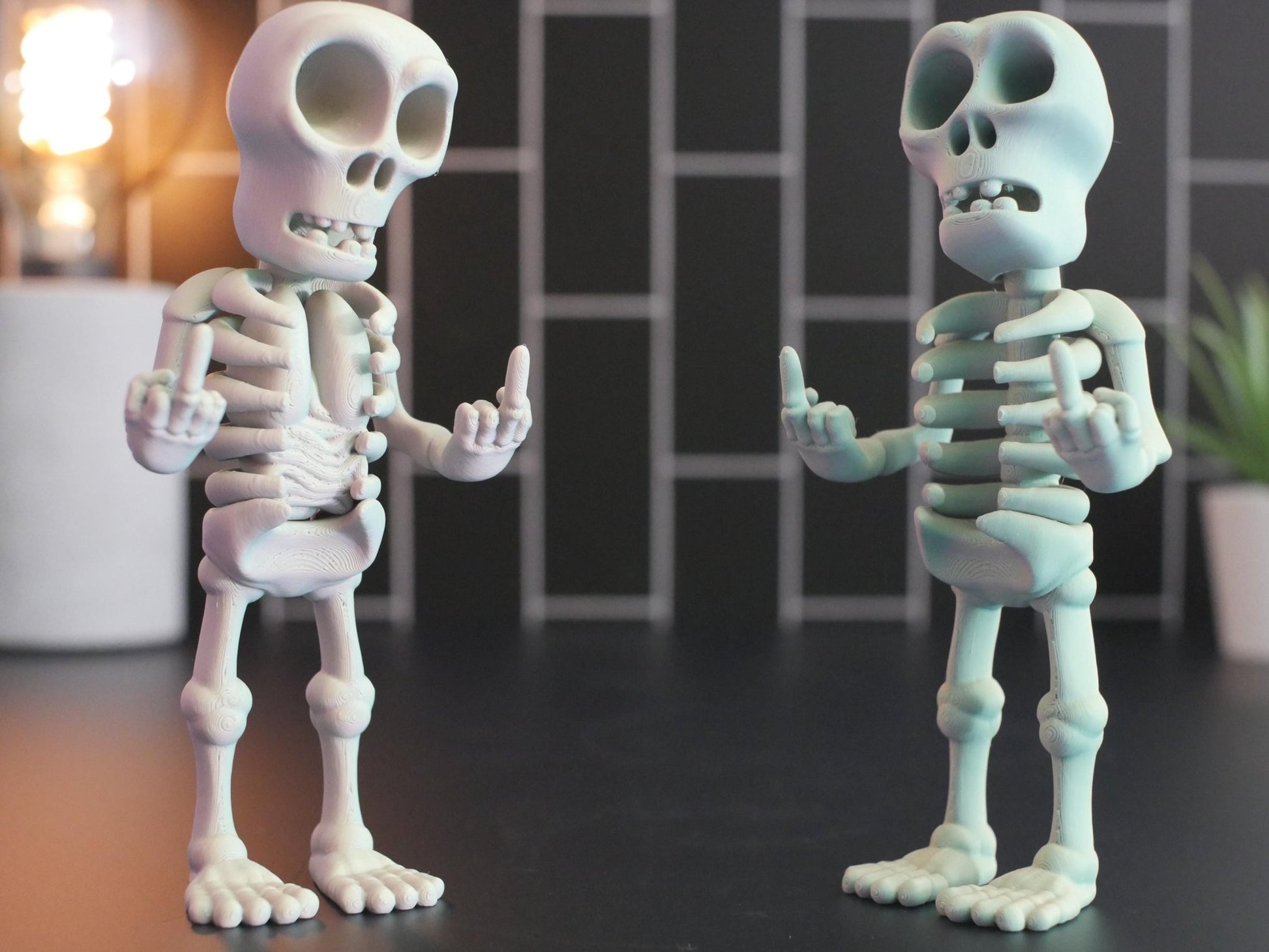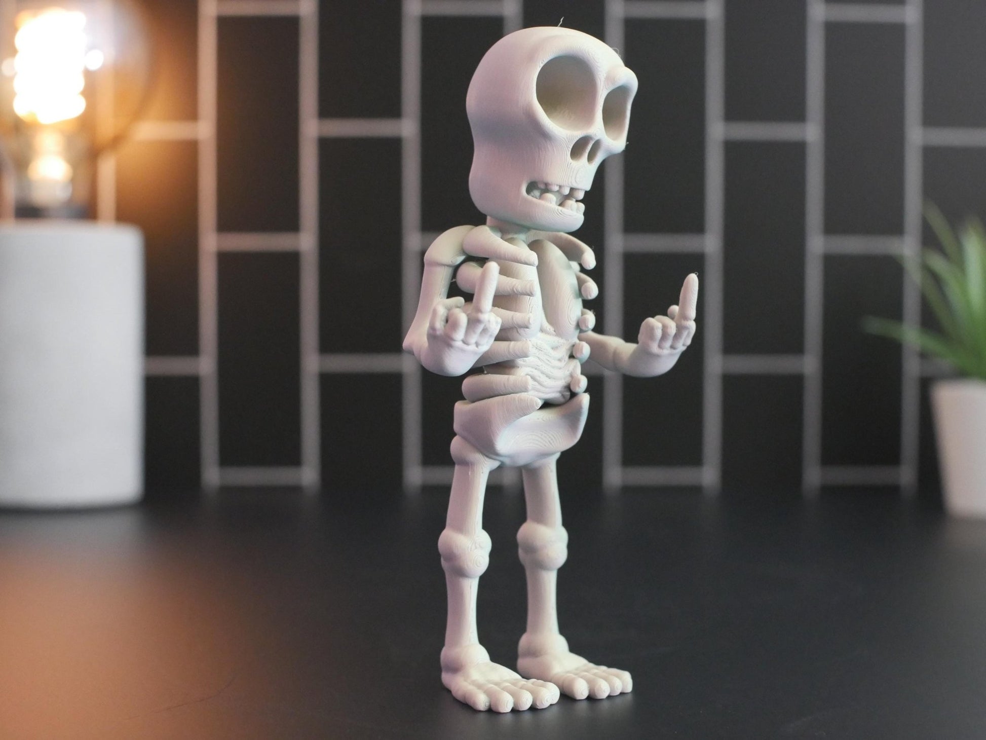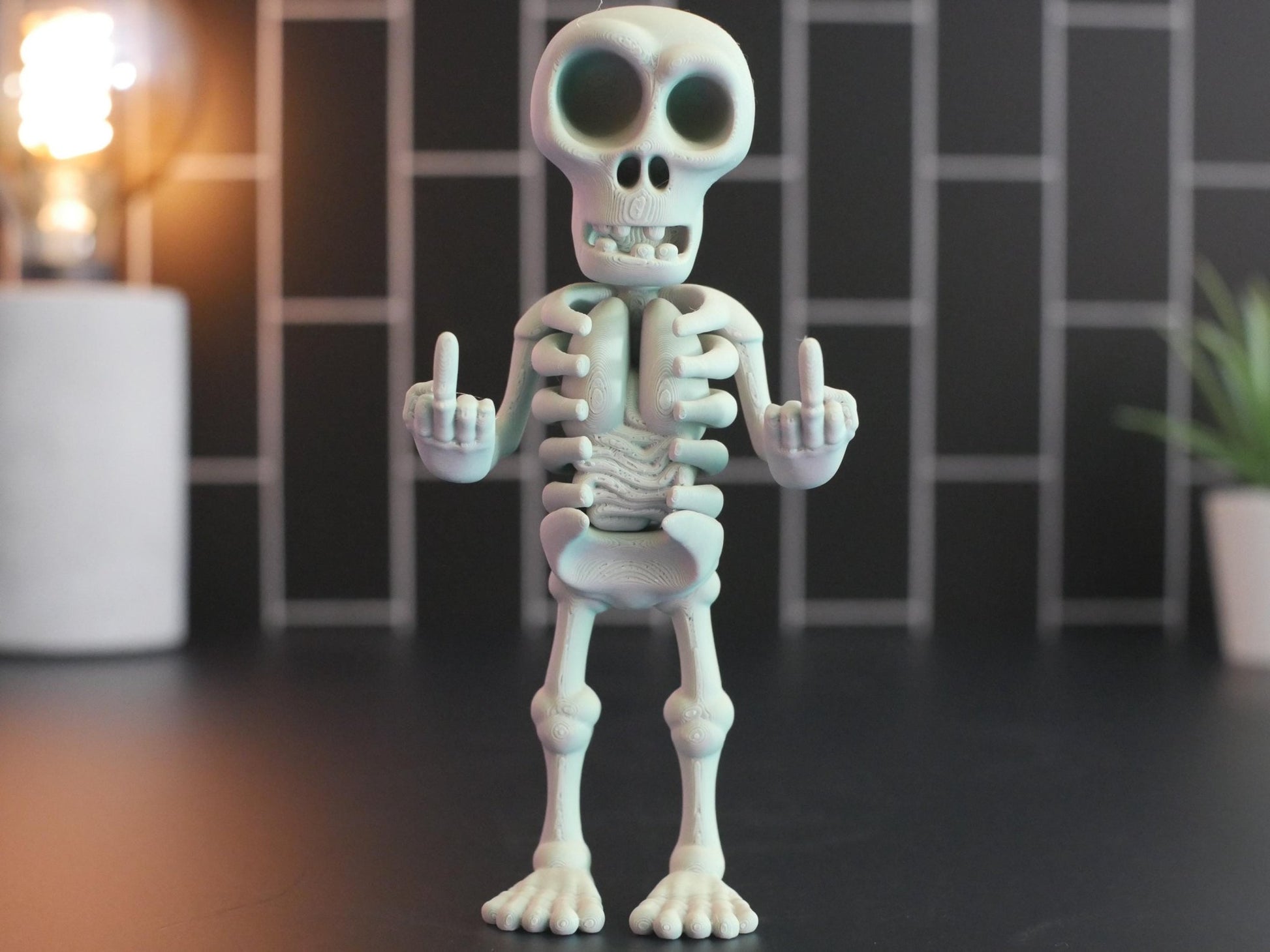 Esqueleto articulado con dedo medio. Regalo perfecto para una decoración divertida y única con sentido del humor.