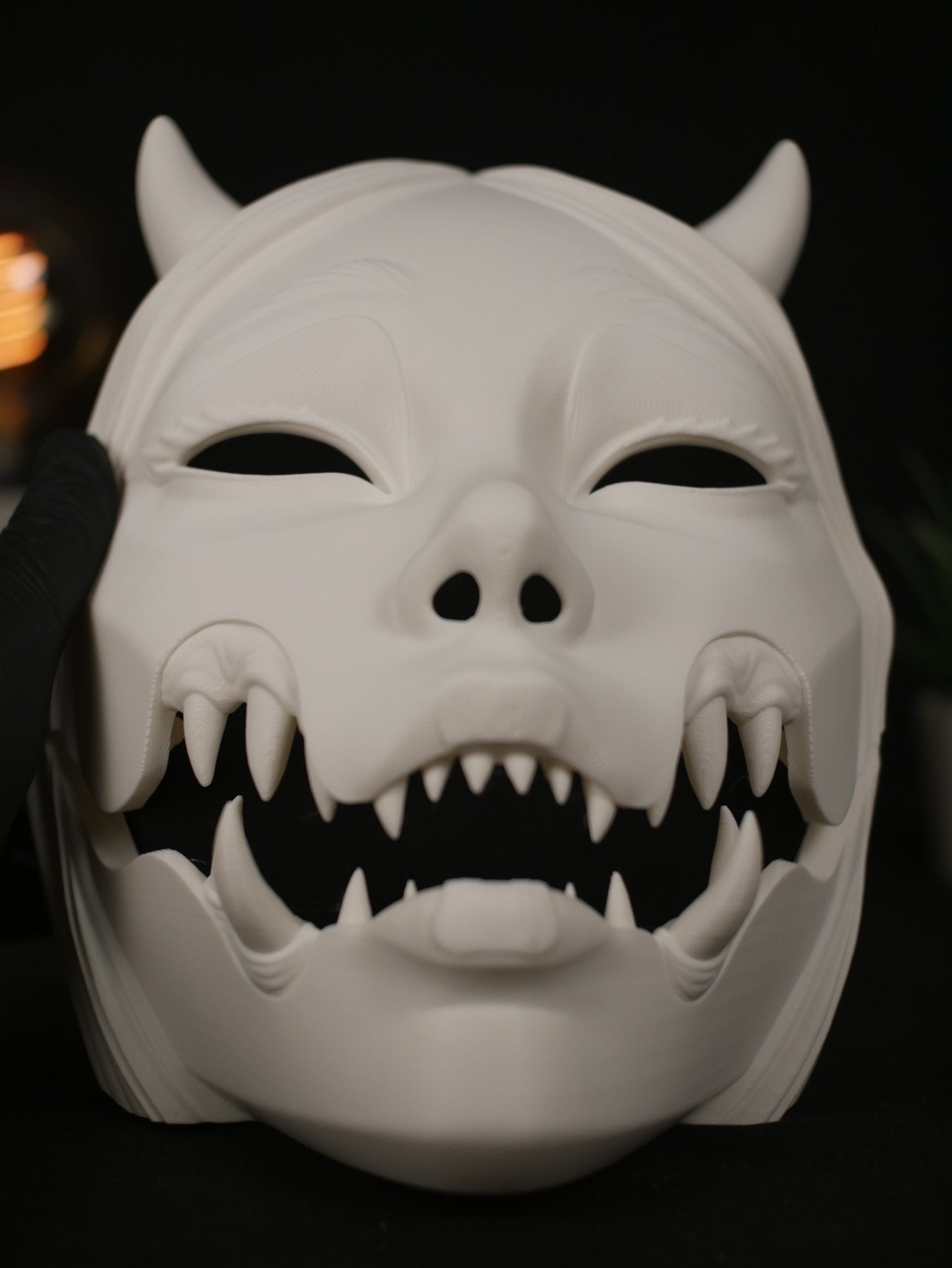 - Diseño: Esculpido de alta fidelidad con fusión de cuernos Oni y boca rasgada.