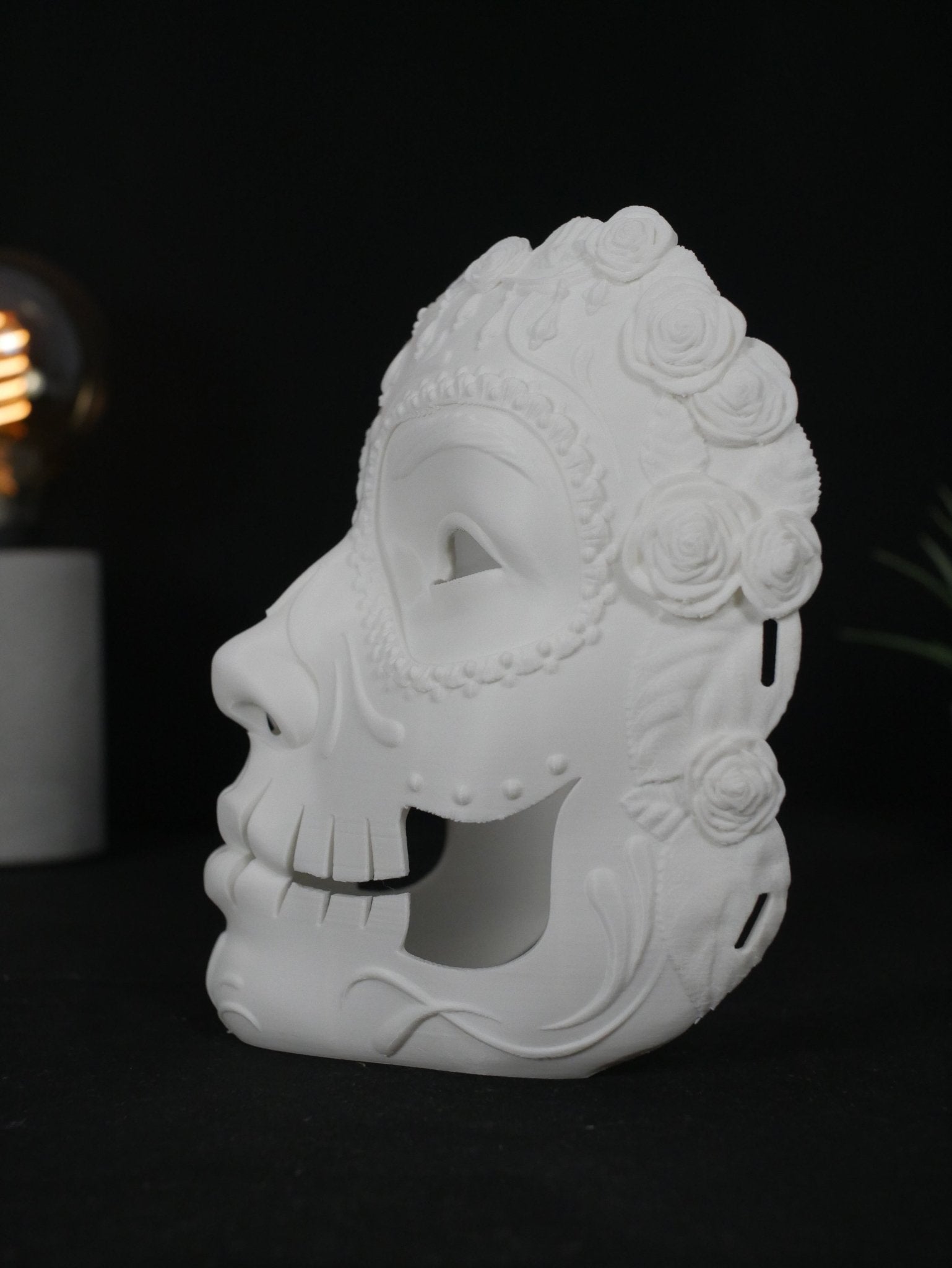 Eleva tu cosplay o disfraz con esta impresionante Máscara de Catrina estilo Calavera de Azúcar. Diseñada con intrincados detalles florales y una estética impactante, es la pieza central ideal para destacar en cualquier fiesta de Halloween, festival o sesión de fotos.