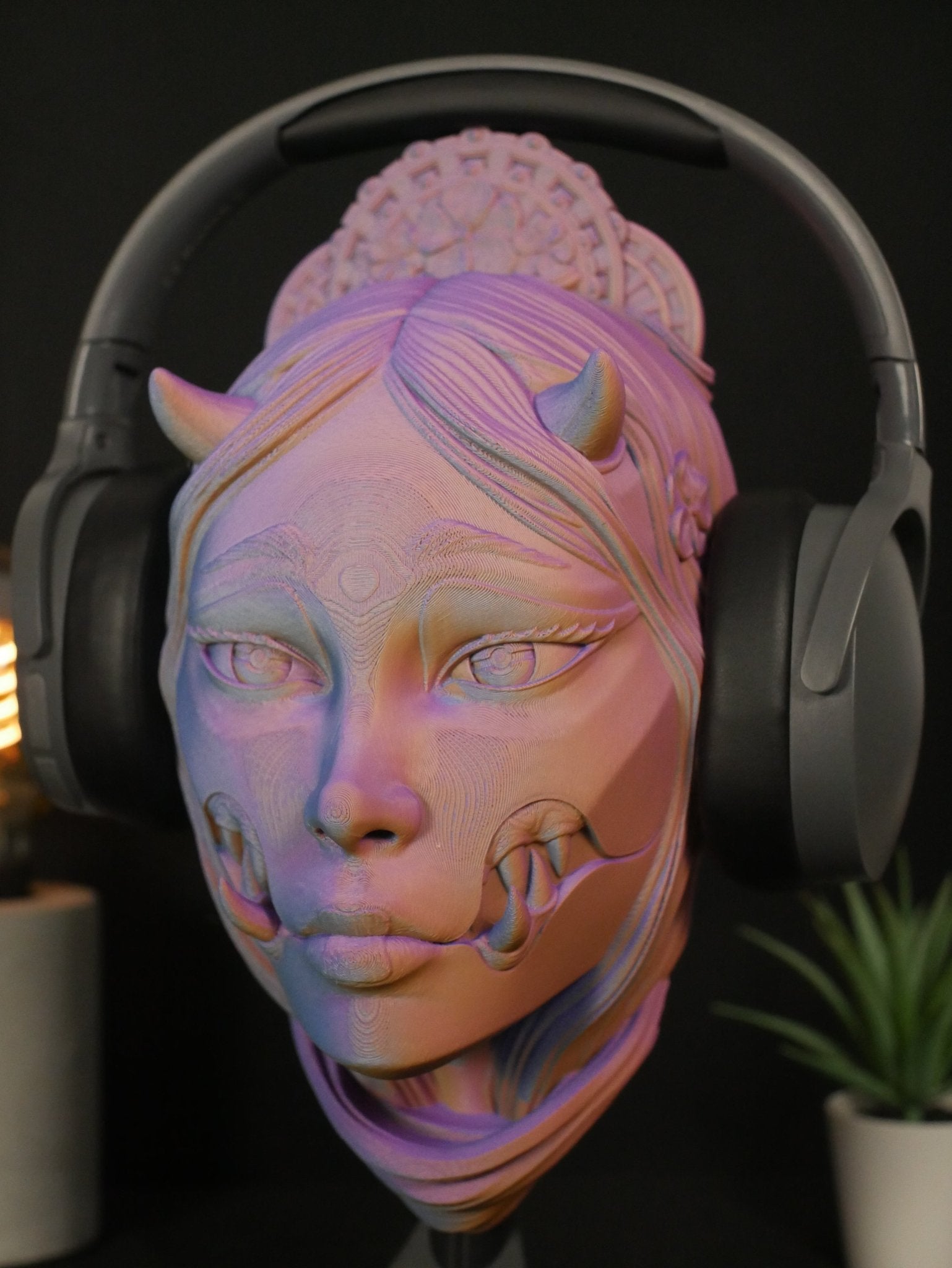 Soporte para auriculares Kuchisake. Demonio Oni japonés como accesorio de escritorio gaming. Regalo único para jugadores.